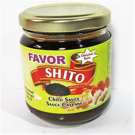 This is the famous Ghanaian hot chilli condiment. Shito sauce consists primarily of fish or vegetable oil, ginger, dried fish, prawns, crustaceans, tomatoes, garlic, peppers and spices.